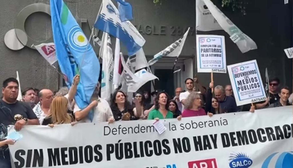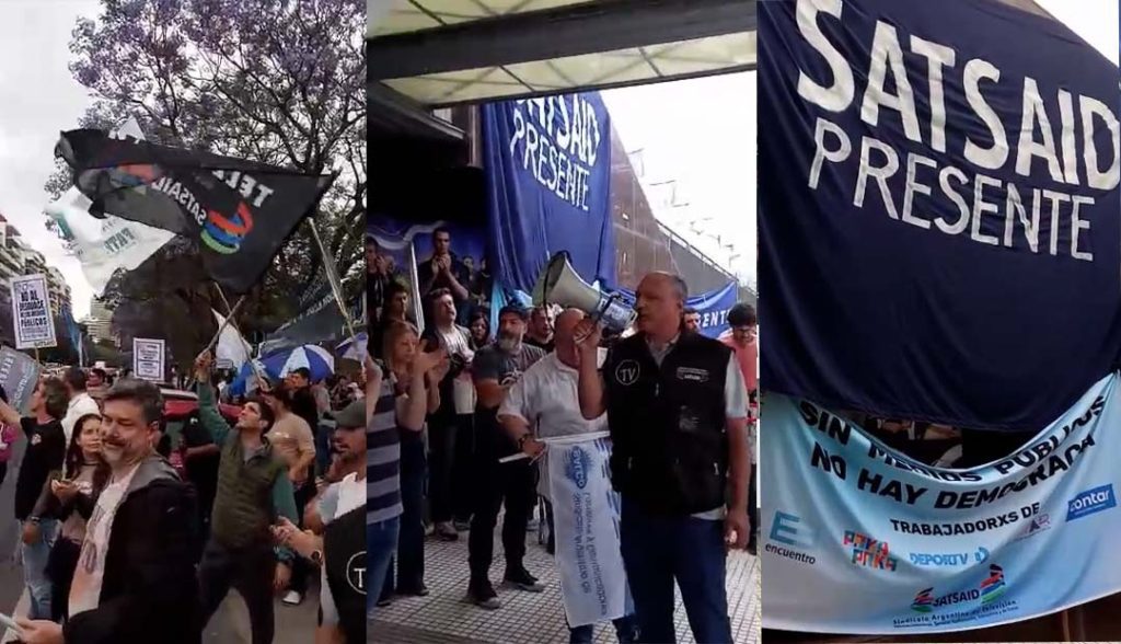 El SATSAID participó activamente de una nueva jornada de visibilización de la lucha en defensa de los medios públicos, que contó en esta oportunidad con un paro de cuatro horas (de 11 a 15) en la Televisión Pública y una movilización dentro y fuera del histórico edificio de Av. Figueroa Alcorta y Tagle, en la Ciudad de Buenos Aires. La acción gremial fue realizada en unidad junto al Sindicato de Prensa de Buenos Aires – SiPreBA, la Asociación de Personal Jerárquico de la TV Pública – APJ; y el Sindicato Argentino de Locutores y Comunicadores – SALCo.