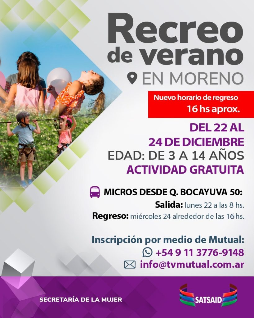 Desde la Secretaría de Mujer y Familia del SATSAID, que conduce la compañera Marianela Mel, los/as invitamos a participar del próximo recreo de verano que se realizará del 22 al 24 de diciembre en el camping 12 de Agosto, en Moreno.