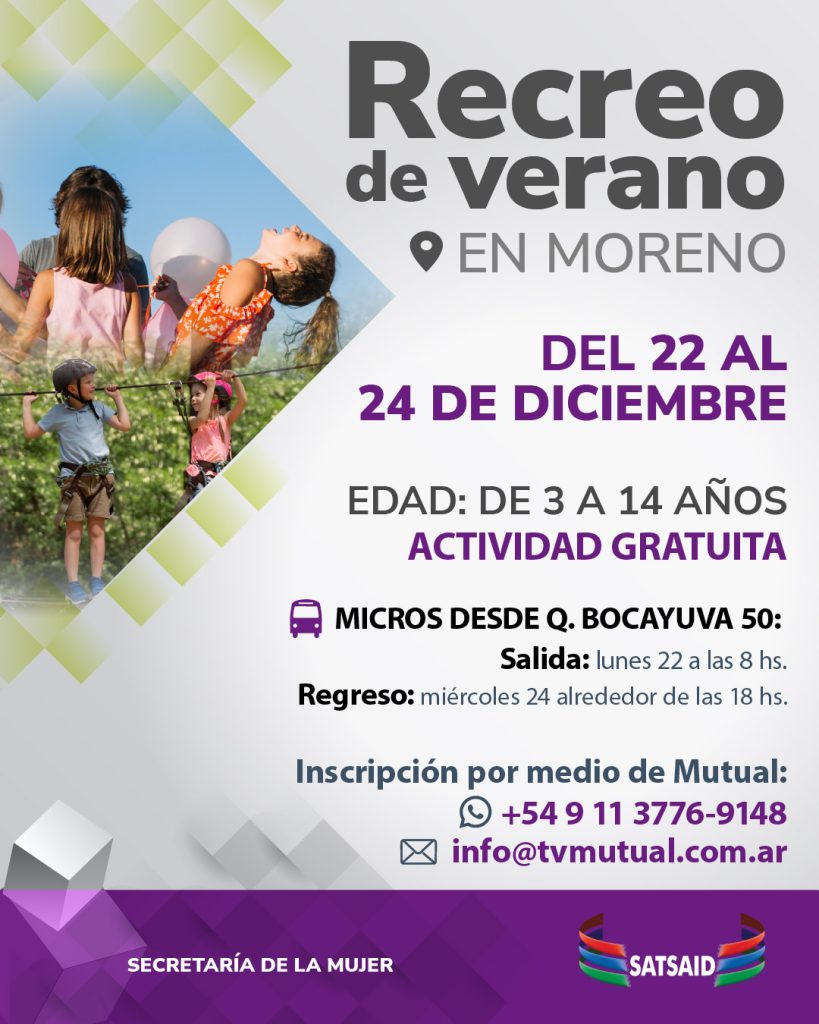 Desde la Secretaría de Mujer y Familia del SATSAID, que conduce la compañera Marianela Mel, los/as invitamos a participar del próximo recreo de verano que se realizará del 22 al 24 de diciembre en el camping 12 de Agosto, en Moreno.