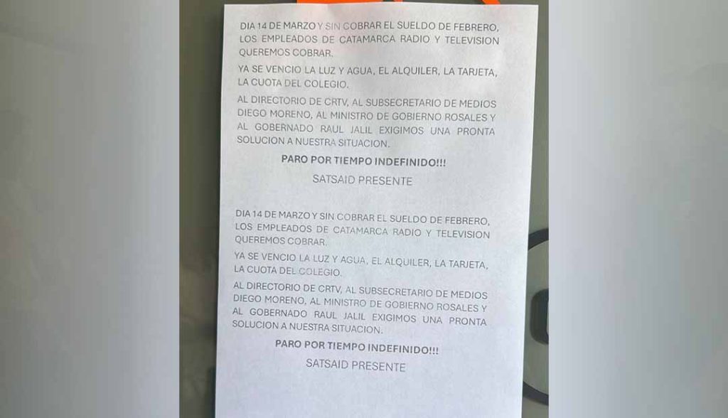 Frente a este panorama, el sindicato presentó una carta formal a la gobernación exigiendo la intervención urgente del gobernador Raúl Jalil para destrabar los fondos y garantizar el pago inmediato de los salarios. “Apelamos a que las autoridades tengan sensibilidad y empatía con los trabajadores y sus familias, que hoy están padeciendo esta situación”, expresó Sager.