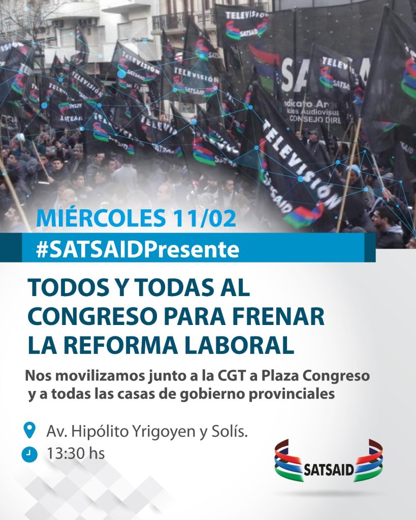 Luego de que el Senado confirmara la sesión del miércoles 11 de febrero con motivo de tratar la Reforma Laboral y tras la convocatoria a movilizar lanzada por la Confederación General del Trabajo (CGT), el SATSAID marchará al Congreso para rechazar un proyecto de ley que sólo busca flexibilizar y precarizar las condiciones de trabajo.