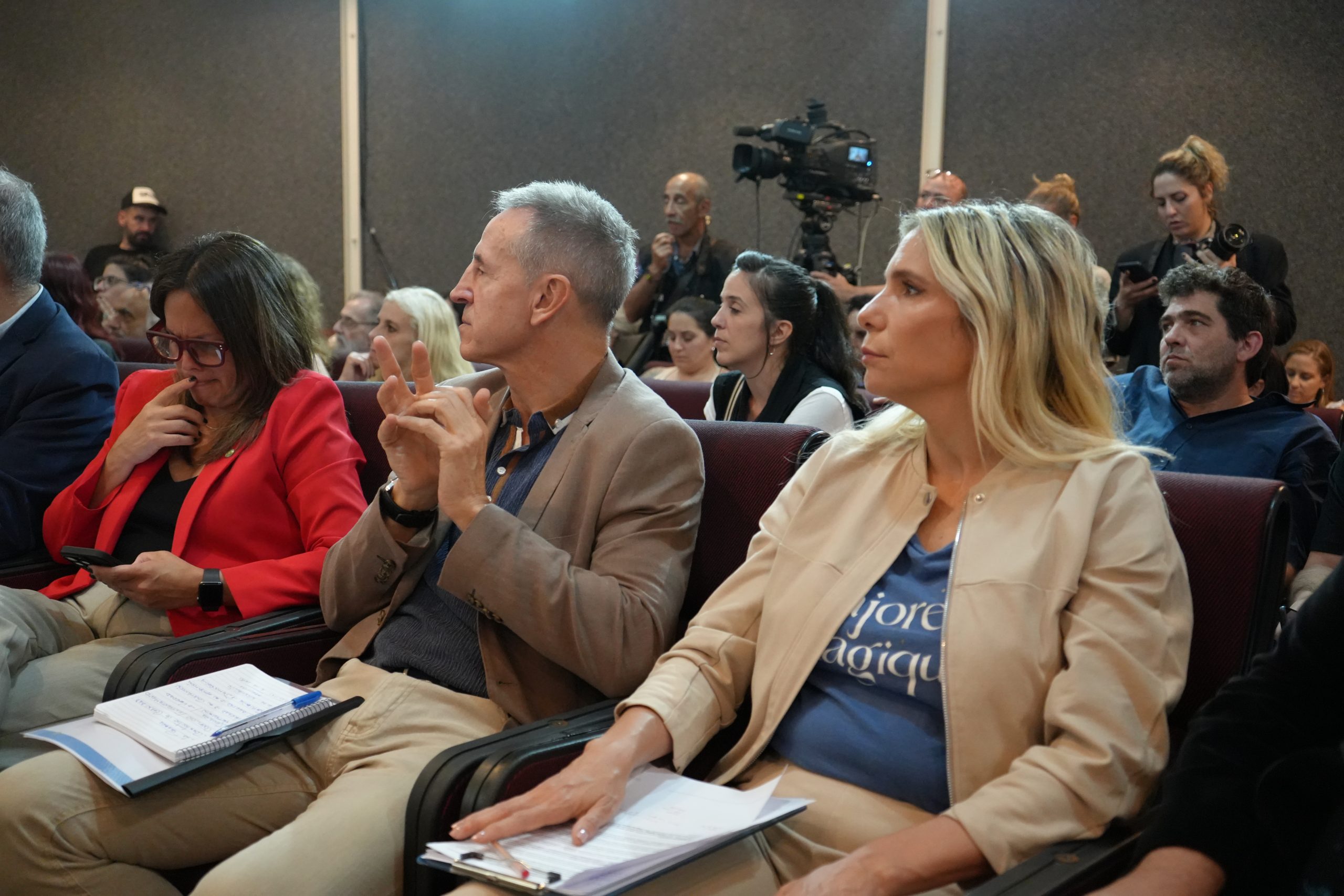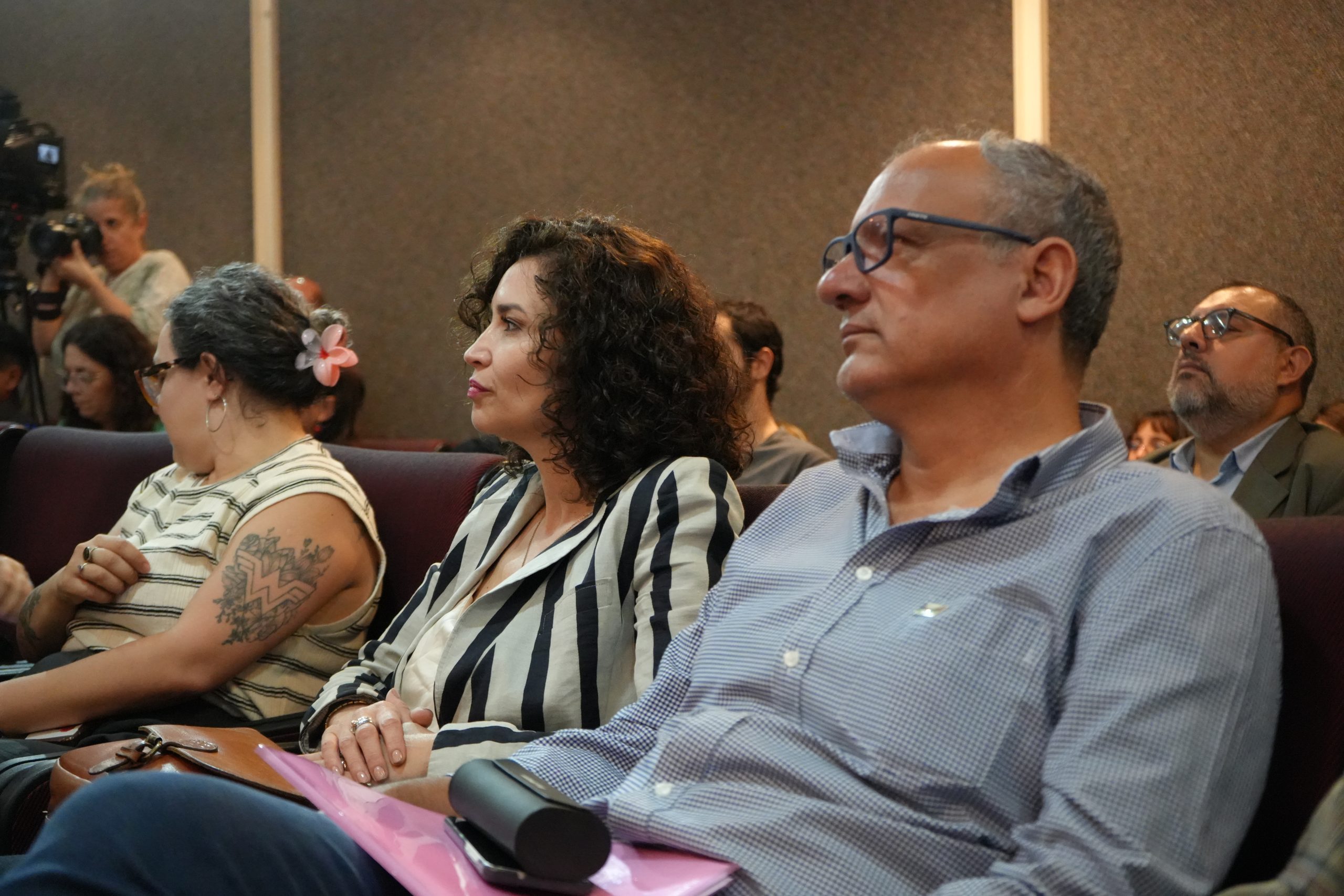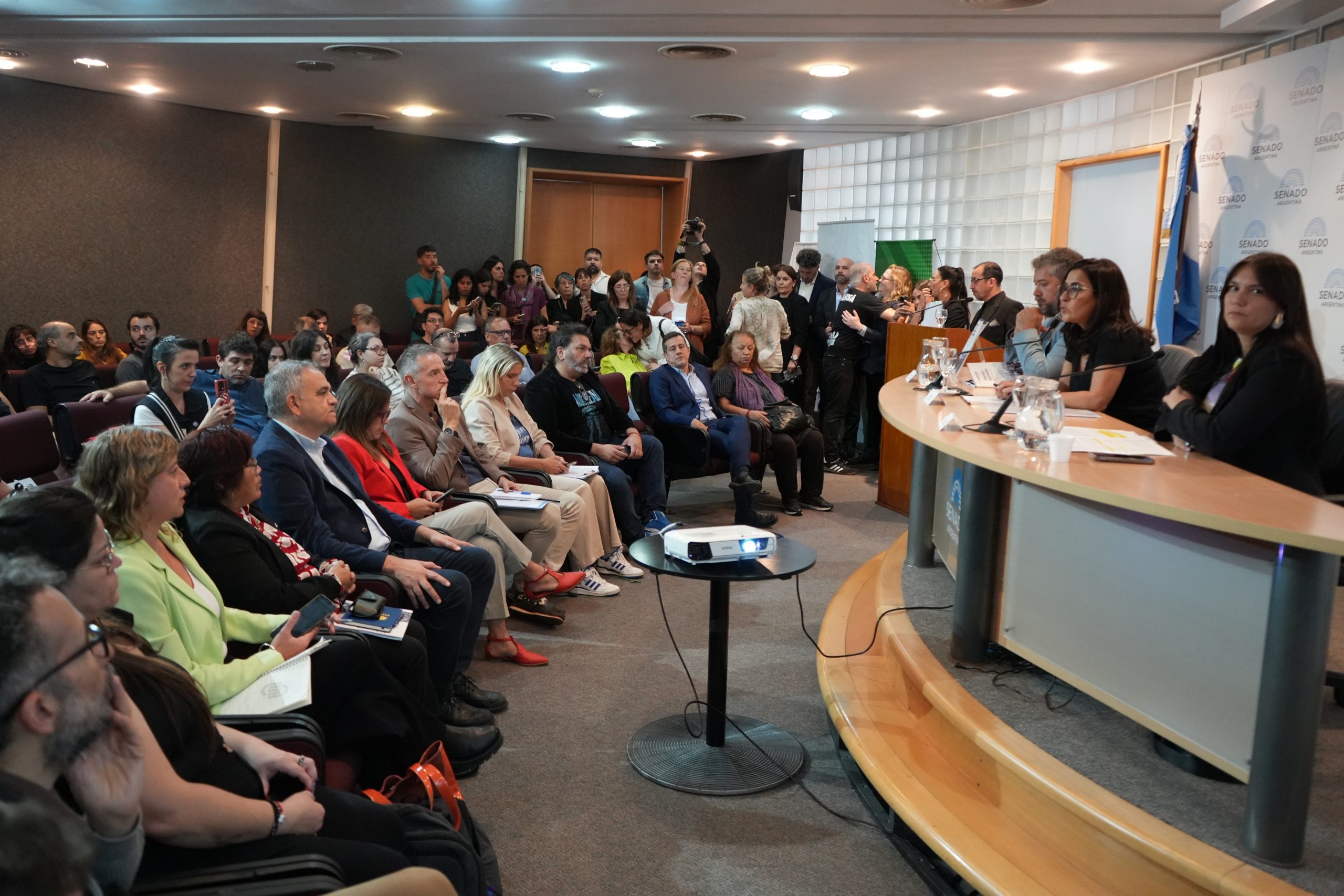 La secretaria de Mujer y Familia, Marianela Mel y el prosecretario de Finanzas y referente de la Televisión Pública, Darío Aguilar, asistieron al evento organizado por la Comisión de Libertad de Expresión del Senado, la UBA, SiPreBA, FATPREN y la FIT.