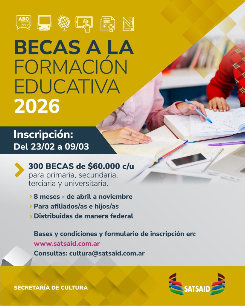 La Secretaría de Cultura del SATSAID pondrá a disposición un total de 300 becas por $60.000 cada una, con vigencia de marzo a noviembre de 2026. La inscripción estará abierta del 23 de febrero hasta el 9 de marzo. ¡No te quedes afuera!