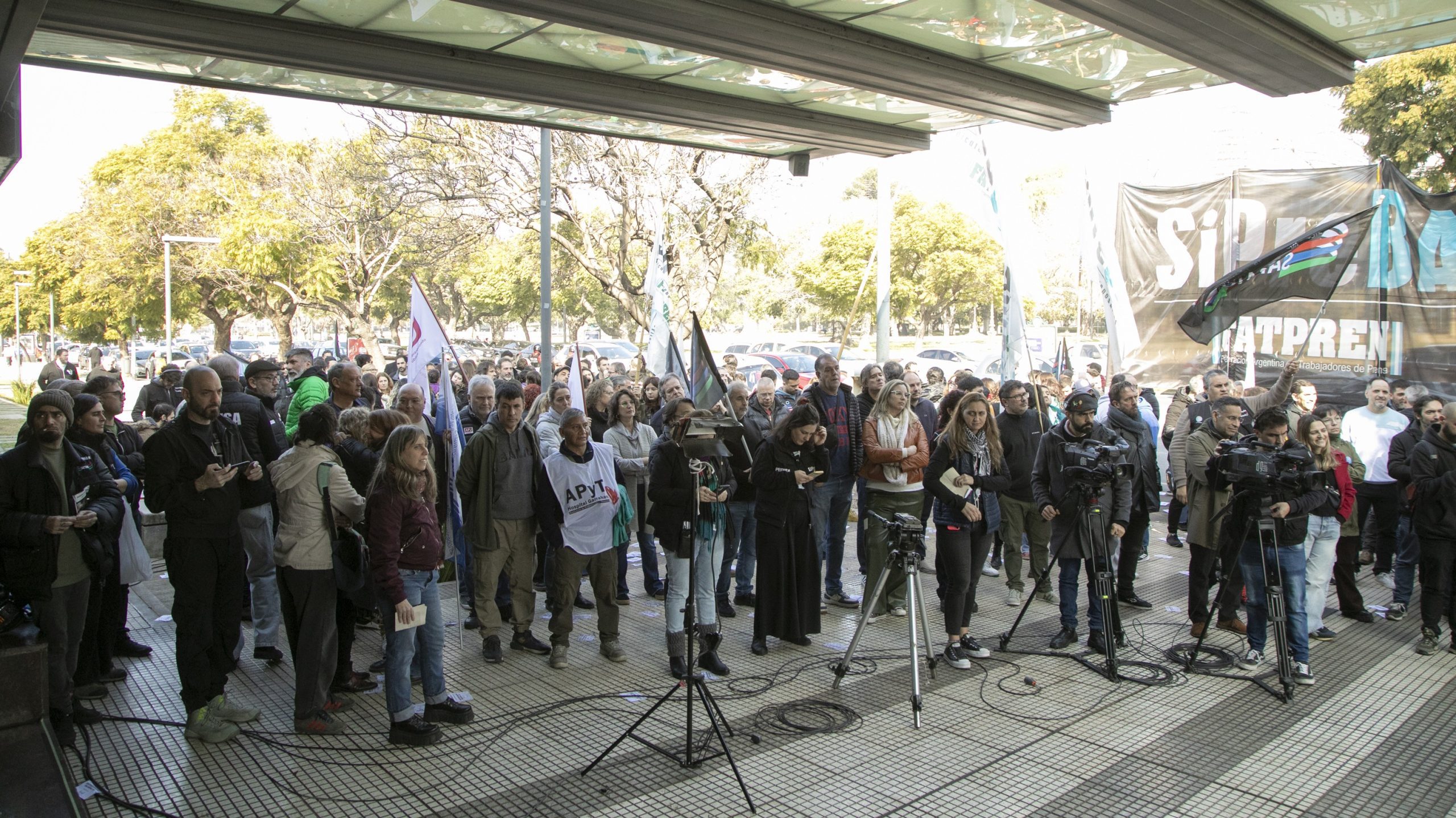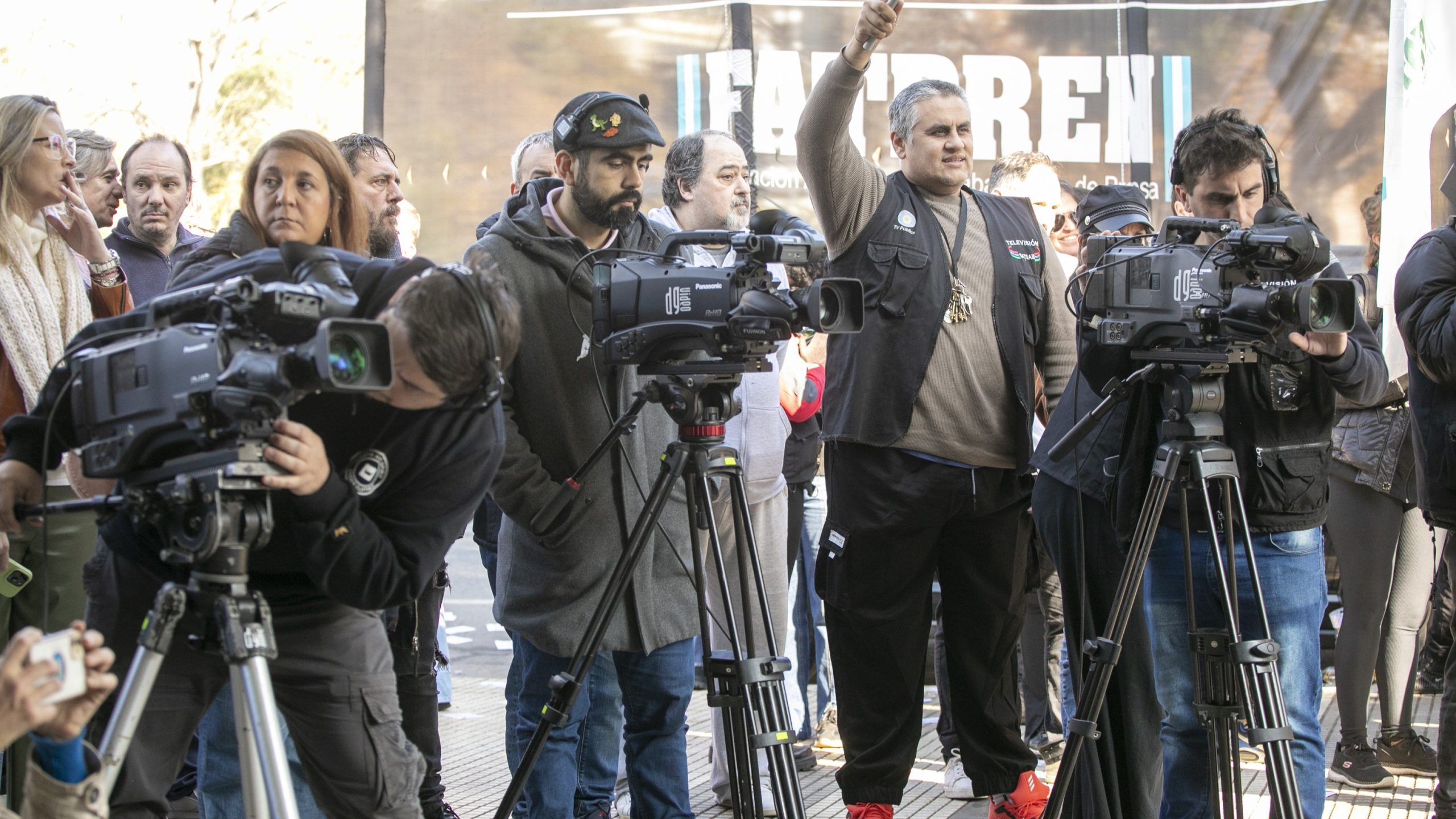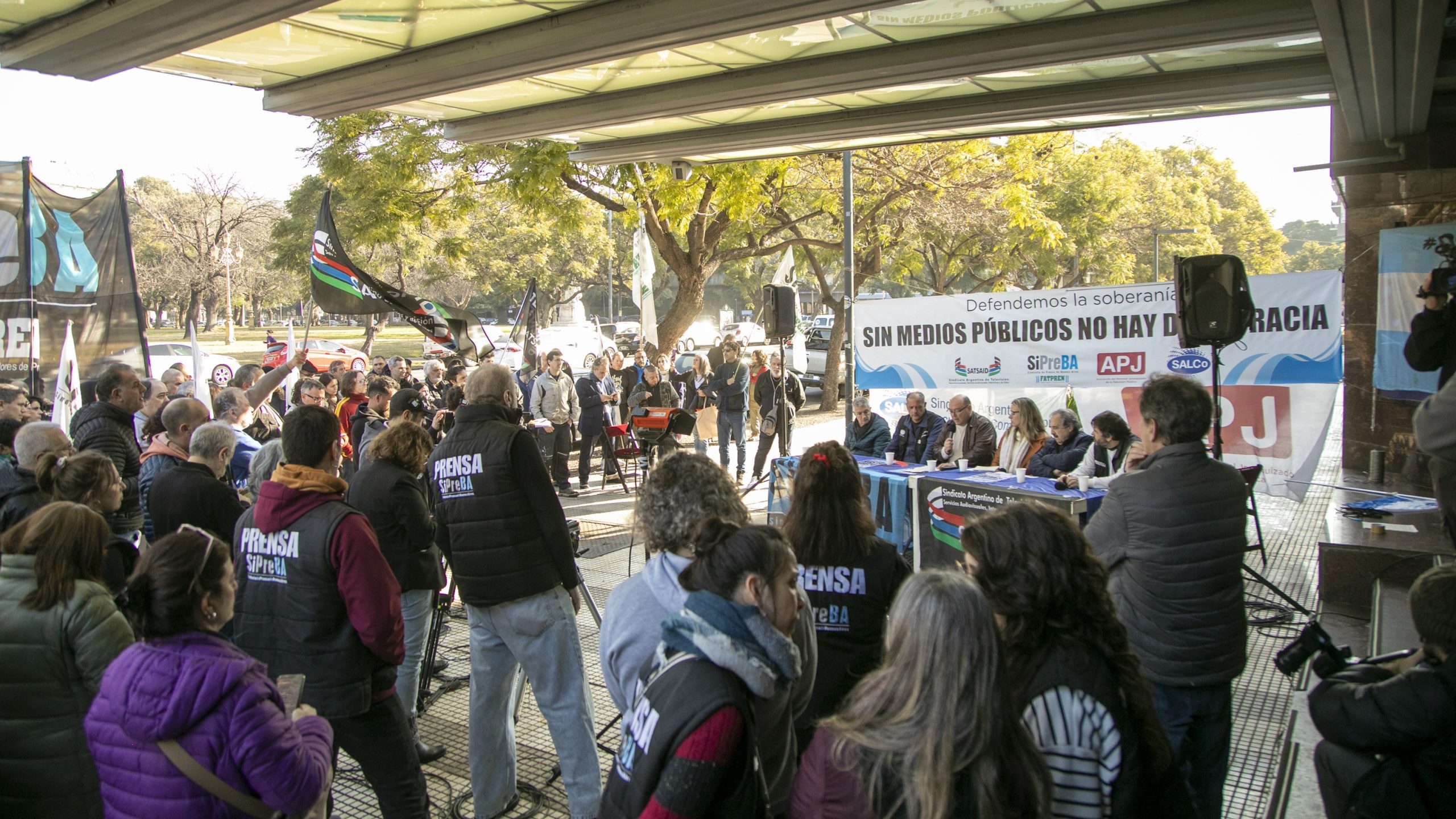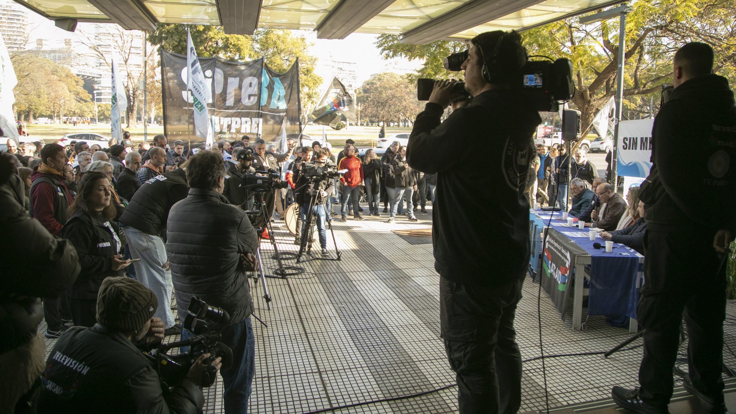 Ante una multitud frente la avenida Figueroa Alcorta, en la Ciudad de Buenos Aires, los compañeros y compañeras montaron un panel desde donde denunciaron plan de vaciamiento de todo el sistema público de comunicación (en particular, de la histórica emisora estatal TVPública) y el congelamiento salarial con el que son castigados desde agosto de 2024.