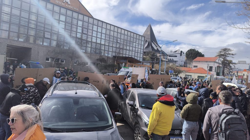 El SATSAID, junto a gremios hermanos, organizaciones sociales y ciudadanos autoconvocados se concentraron frente al hotel donde se encuentra hospedado el presidente Javier Milei, en la ciudad de Ushuaia, para expresar su repudio a las políticas impulsadas por su gestión.